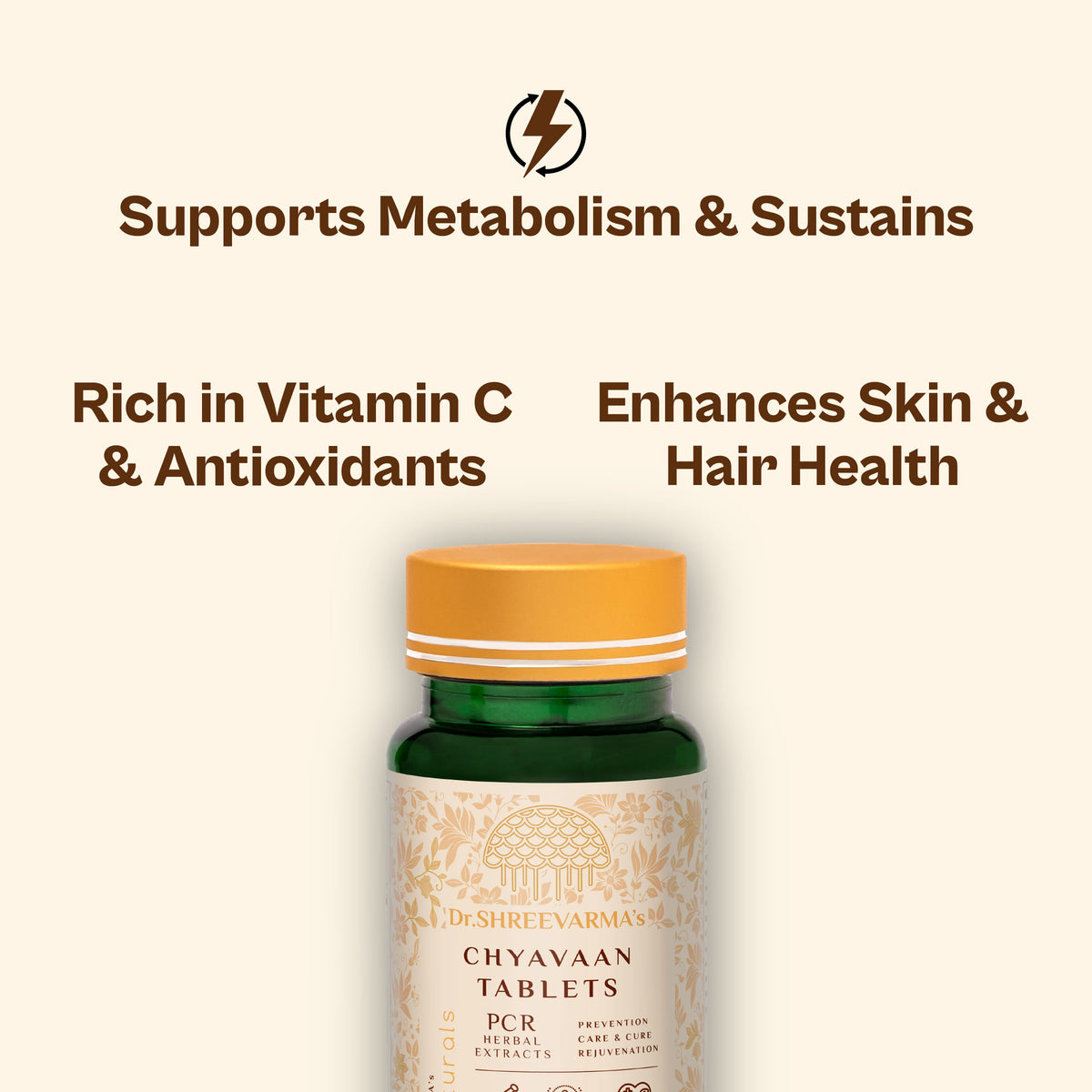 Chyavaan Tablets are Ayurvedic rejuvenation tablets that help boost immunity, improve energy levels, and support respiratory health. Inspired by the traditional Chyawanprash formula.