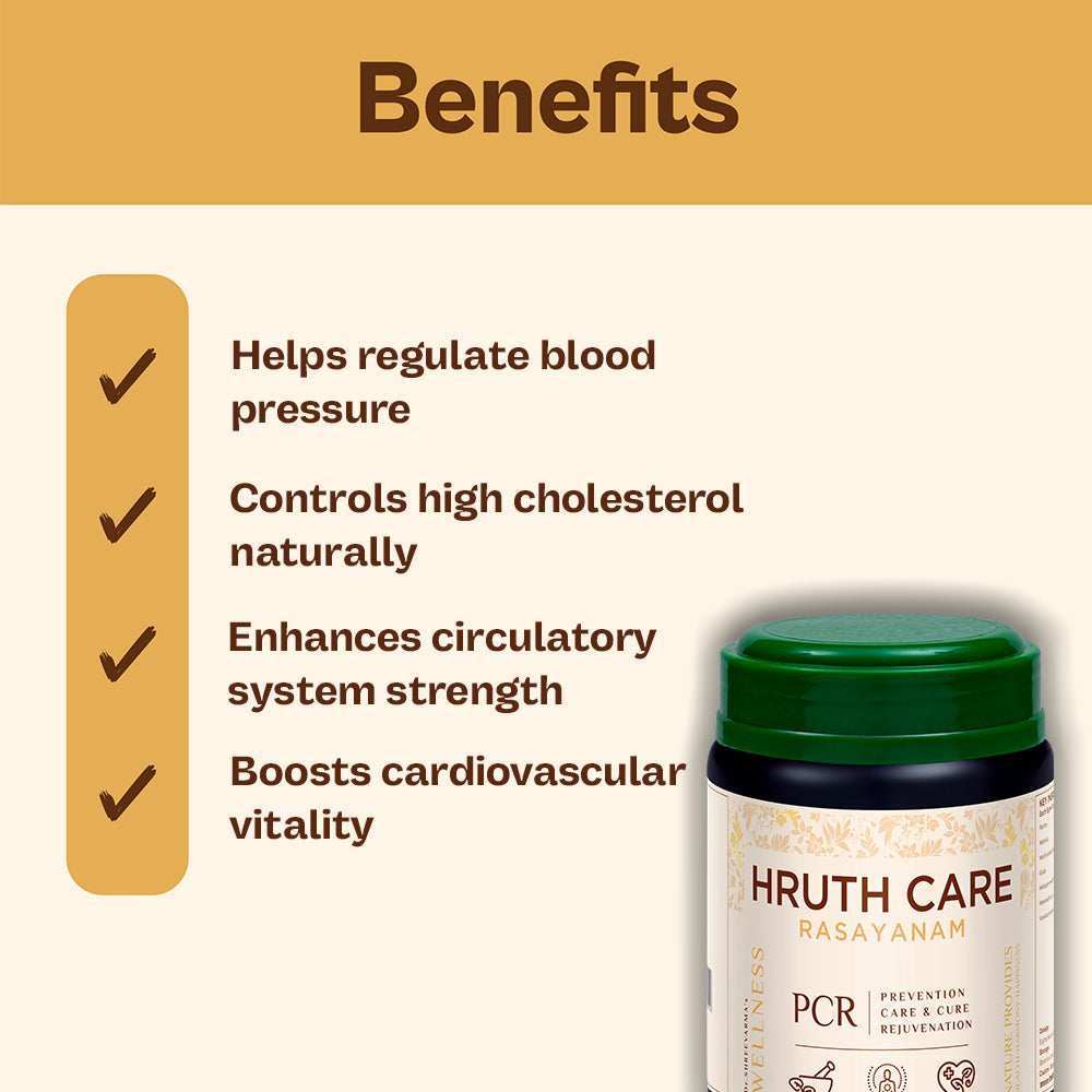 Hruth Care Rasayanam is a powerful Ayurvedic formulation crafted to support heart function, strengthen cardiac muscles, and improve circulation. With rejuvenative herbs like Arjuna (Partha), Mridwika, Madhuka Pushpa, and classical preparations like Hridayarnava Rasa and Makaradhwaja, it helps regulate blood pressure, balance cholesterol, detoxify the blood, and promote overall cardiovascular vitality. This rasayanam is highly effective for various heart and circulatory disorders linked to Rasavaha and Raktavaha Srotas, offering natural cardio-protection and long-term wellness.