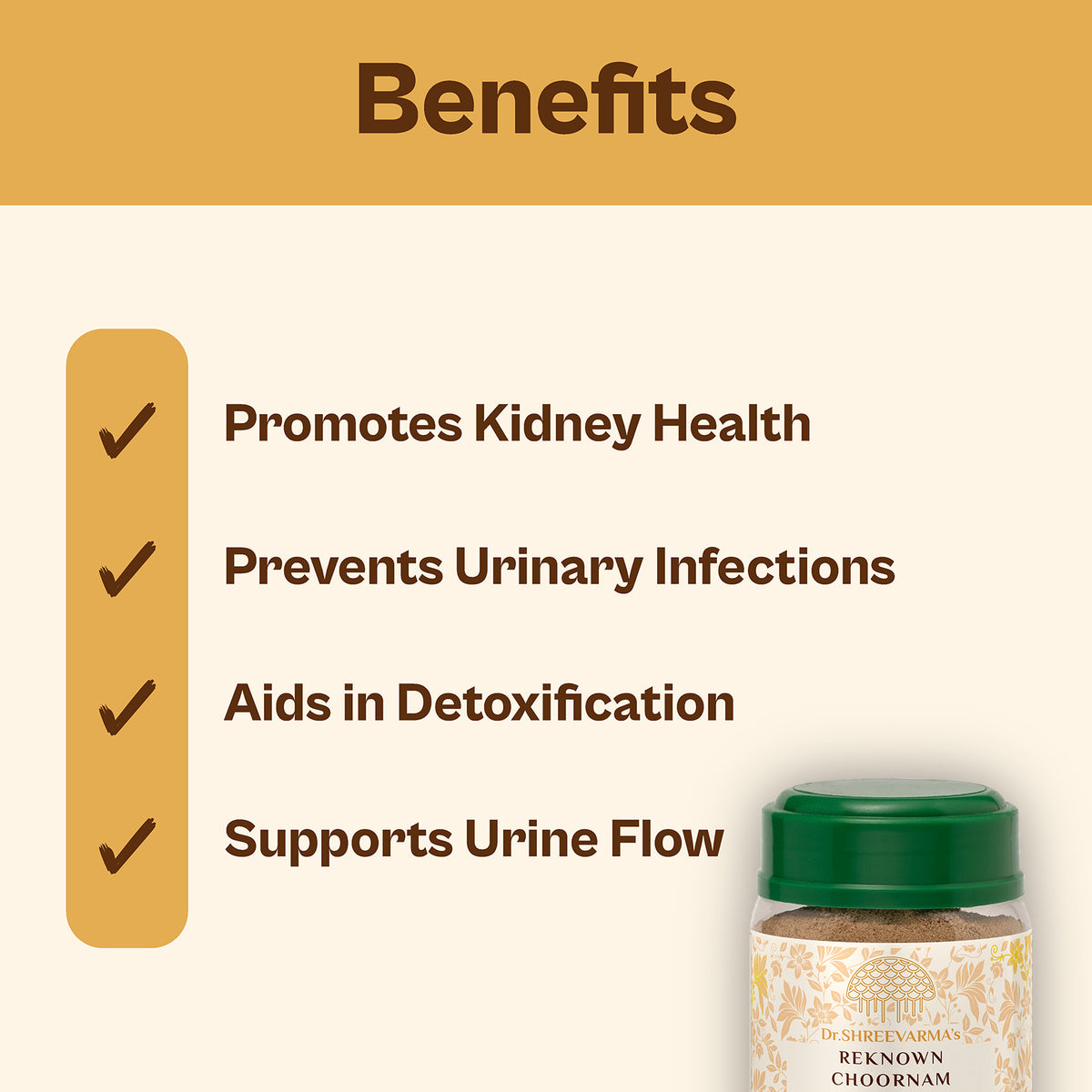 Reknown Choornam is a herbal powder that helps cleanse the urinary system, manage kidney stone symptoms, and support natural detoxification of the kidneys.
