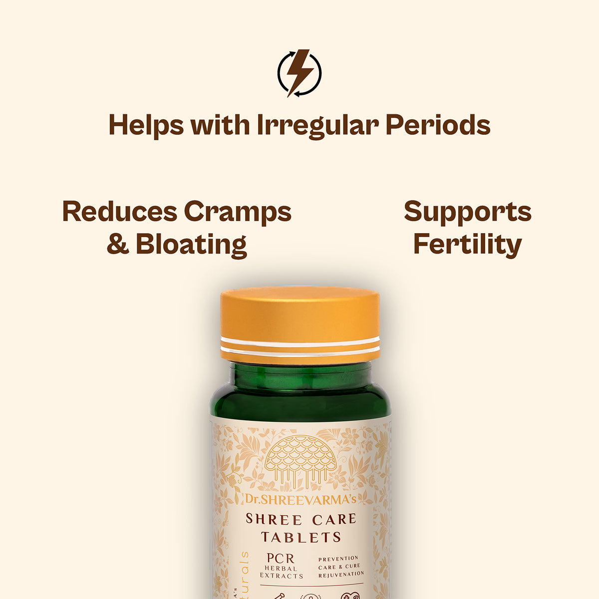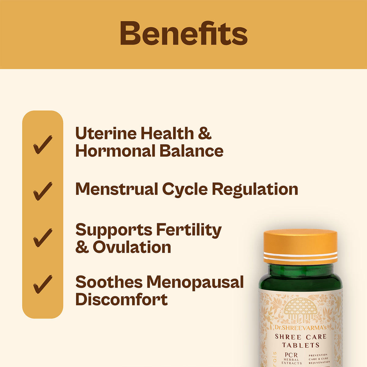 Shreecare Tablets are Ayurvedic women's wellness supplements that support hormonal balance, regulate menstrual cycles, and help with PCOD, white discharge, and general reproductive health.