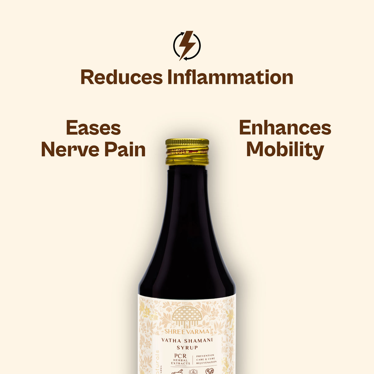 Vatha Shamani Syrup helps pacify Vata dosha and is beneficial in relieving joint pain, muscle cramps, body aches, and nervous system imbalances.