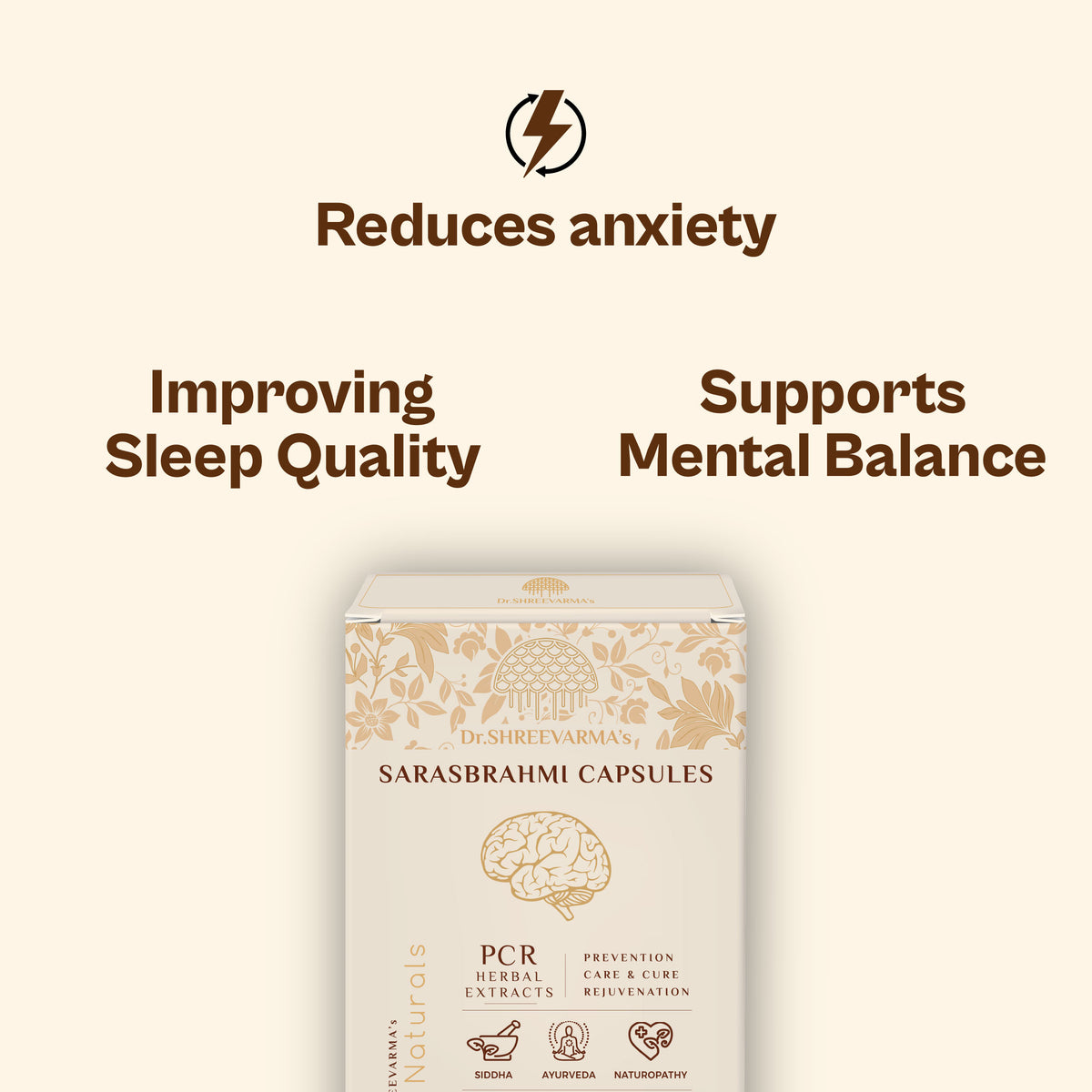 SARASBRAHMI CAPSULES are designed to boost your brain power and calm your mind. These Ayurvedic capsules work to enhance memory, improve concentration, and support learning. They also help reduce anxiety and promote sound sleep, helping you think more clearly and feel more at ease.