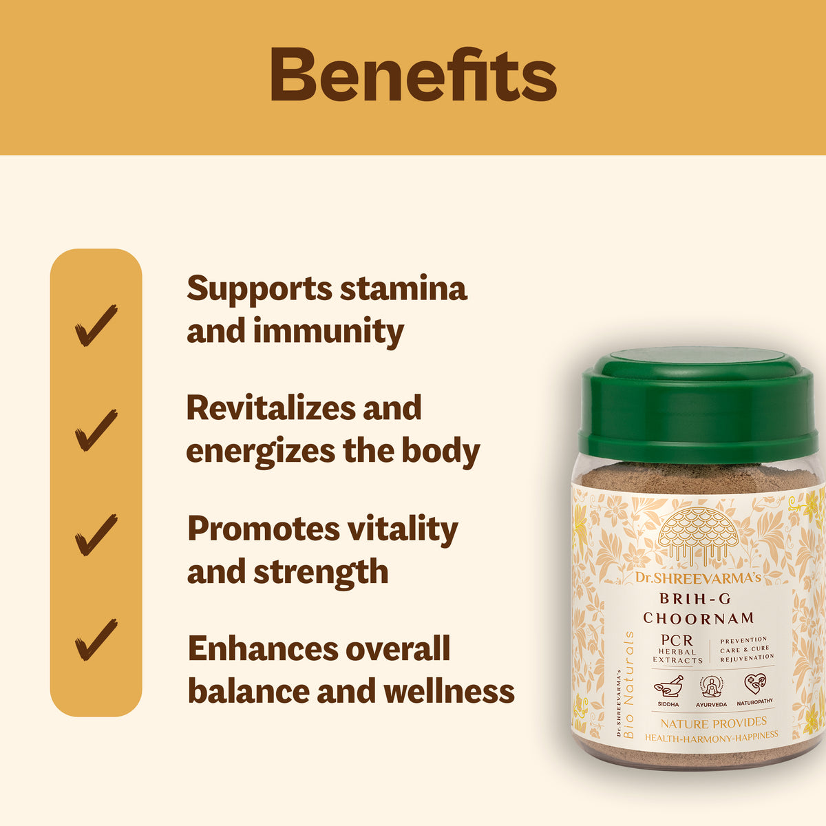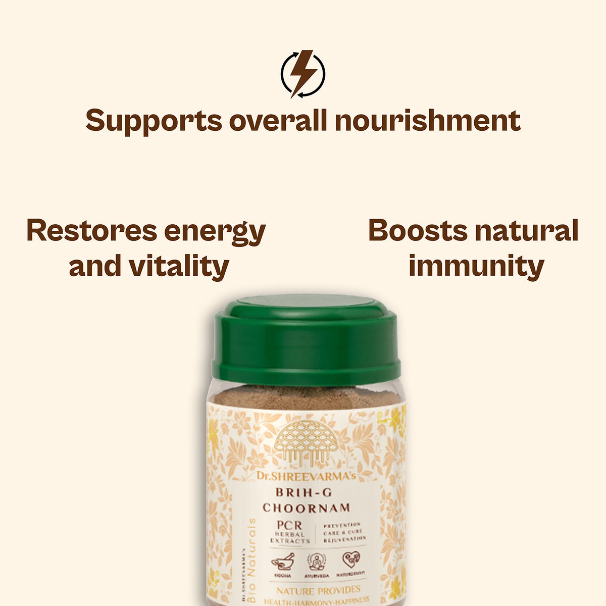 BRIH G CHOORNAM is a traditional Ayurvedic formulation made to support your overall health, immunity, and vitality. Crafted with a time-tested blend of herbs, this choornam helps strengthen your body from within, combat everyday fatigue, and restore natural energy. It’s a holistic way to feel renewed—naturally.